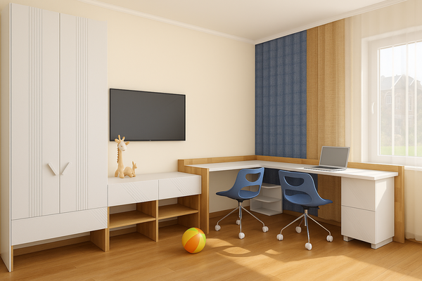 Детская комната с кроватью- чердаком, шкафами и рабочей зоной