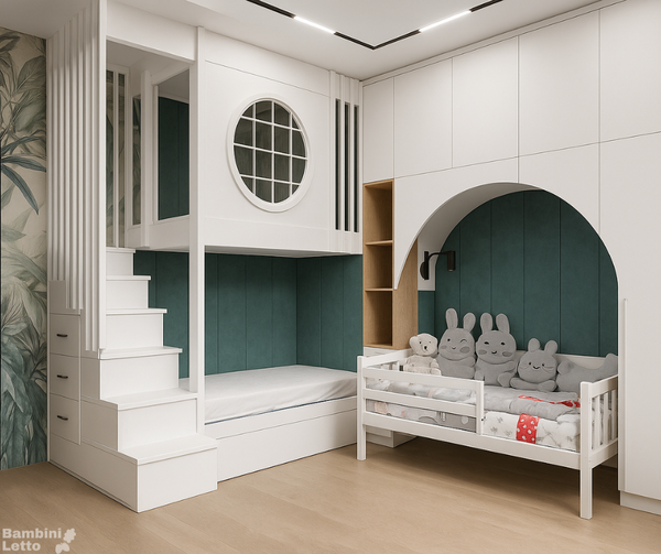 Детская комната с двухъярусной кроватью и спортивной зоной «Зелёный дуб»