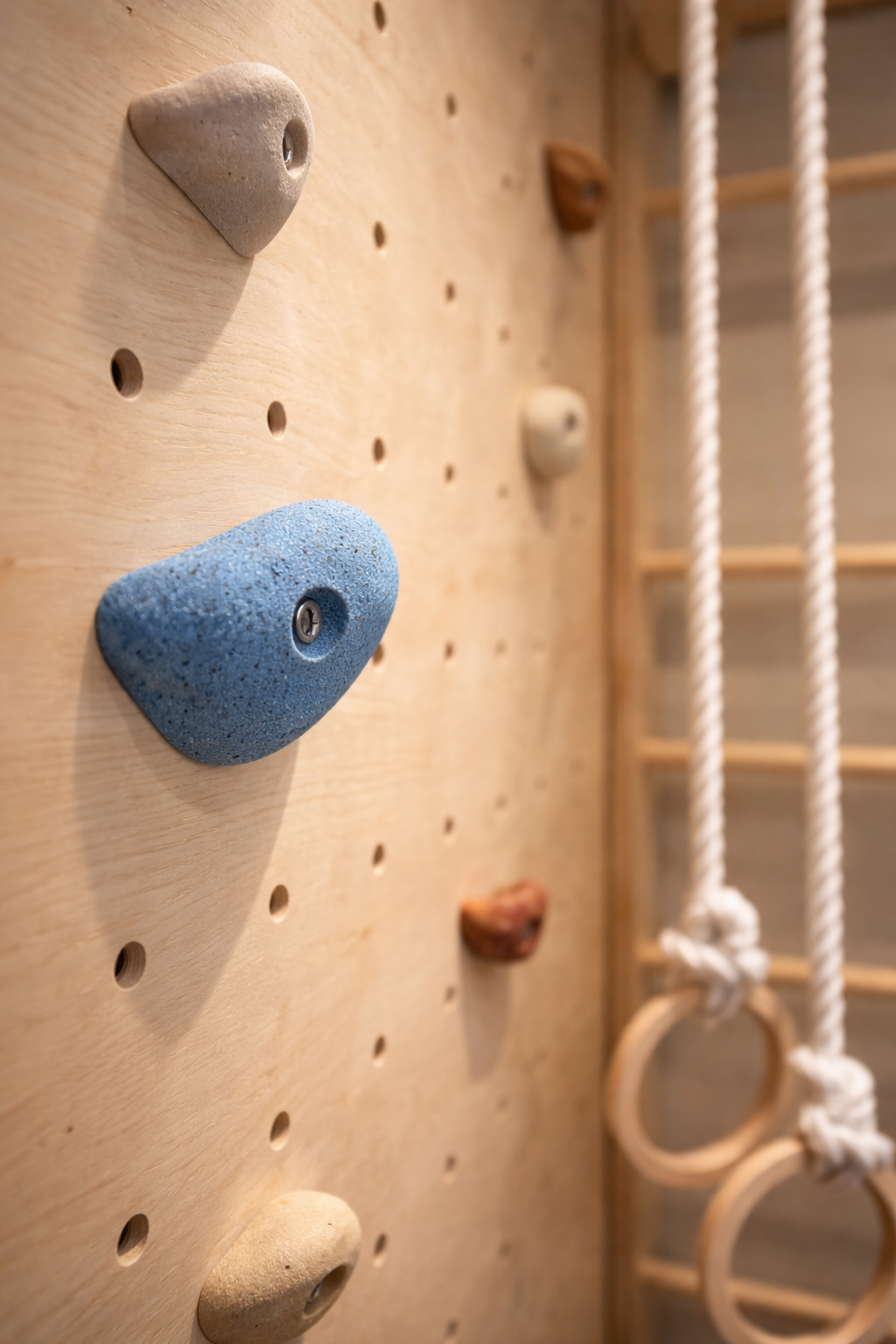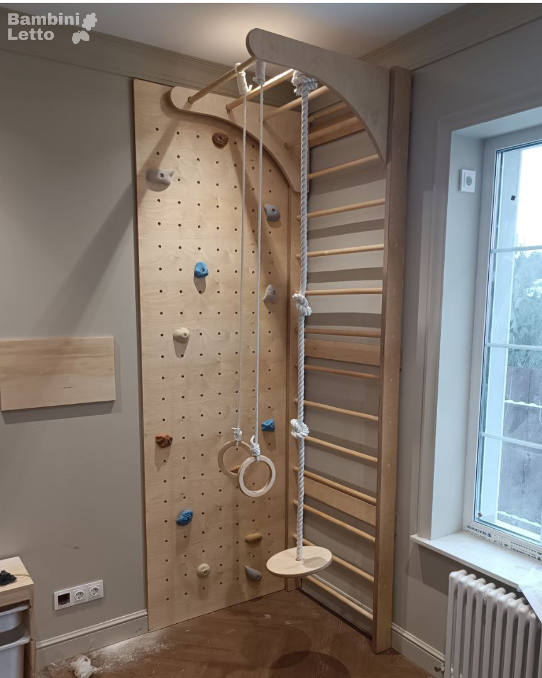 Этот спортивный комплекс создан как активная зона внутри детской комнаты — место для движения, силы и уверенности в своих возможностях. Скалодром, шведская стенка со стационарным турником и гимнастические элементы формируют разнообразные сценарии активности: лазание, подтягивания, баланс и координацию. Комплекс помогает направить энергию ребёнка в движение и делает физическую активность естественной частью повседневной жизни.